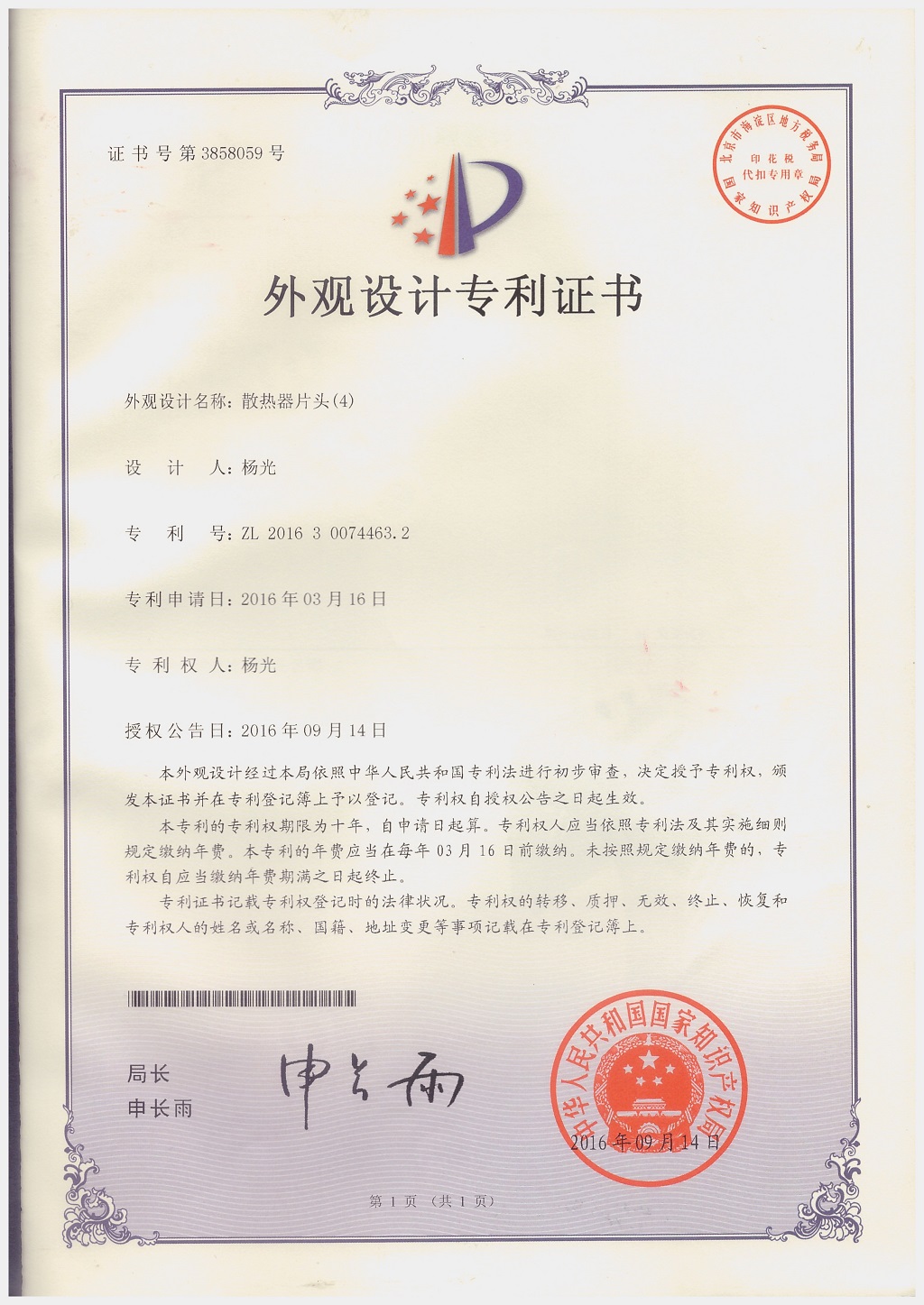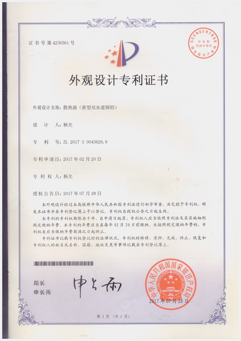 北京金旗艦暖通科技有限公司專利證書