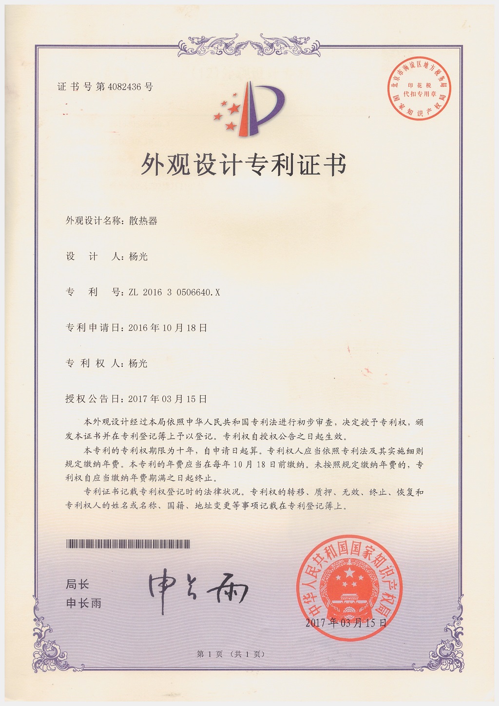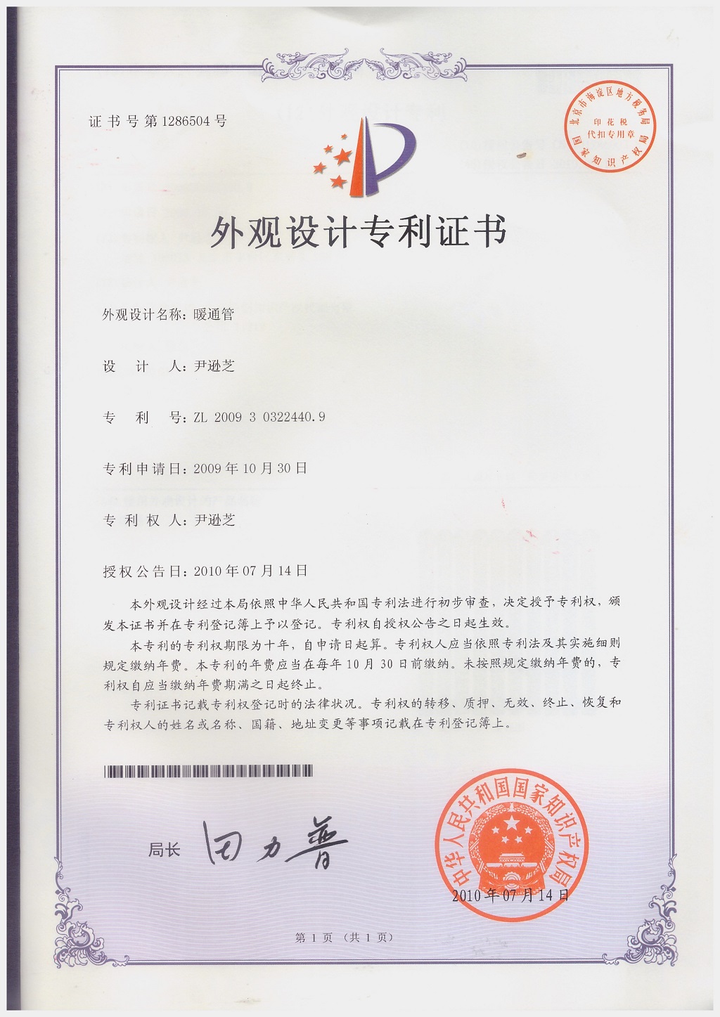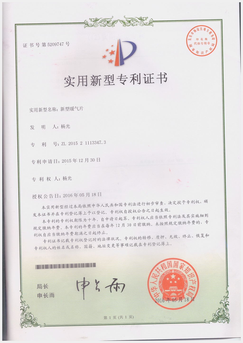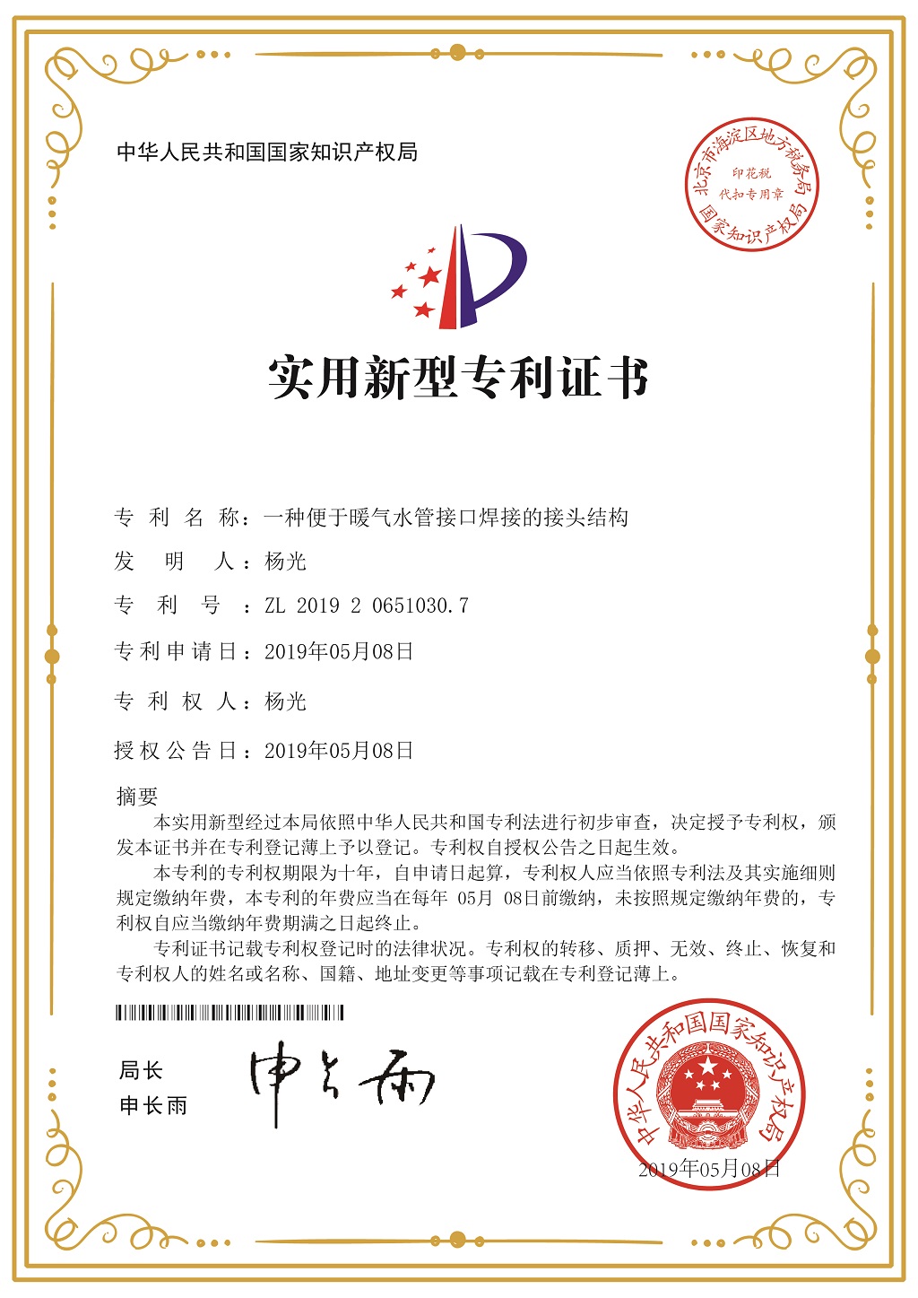 北京金旗艦暖通科技有限公司專利證書
