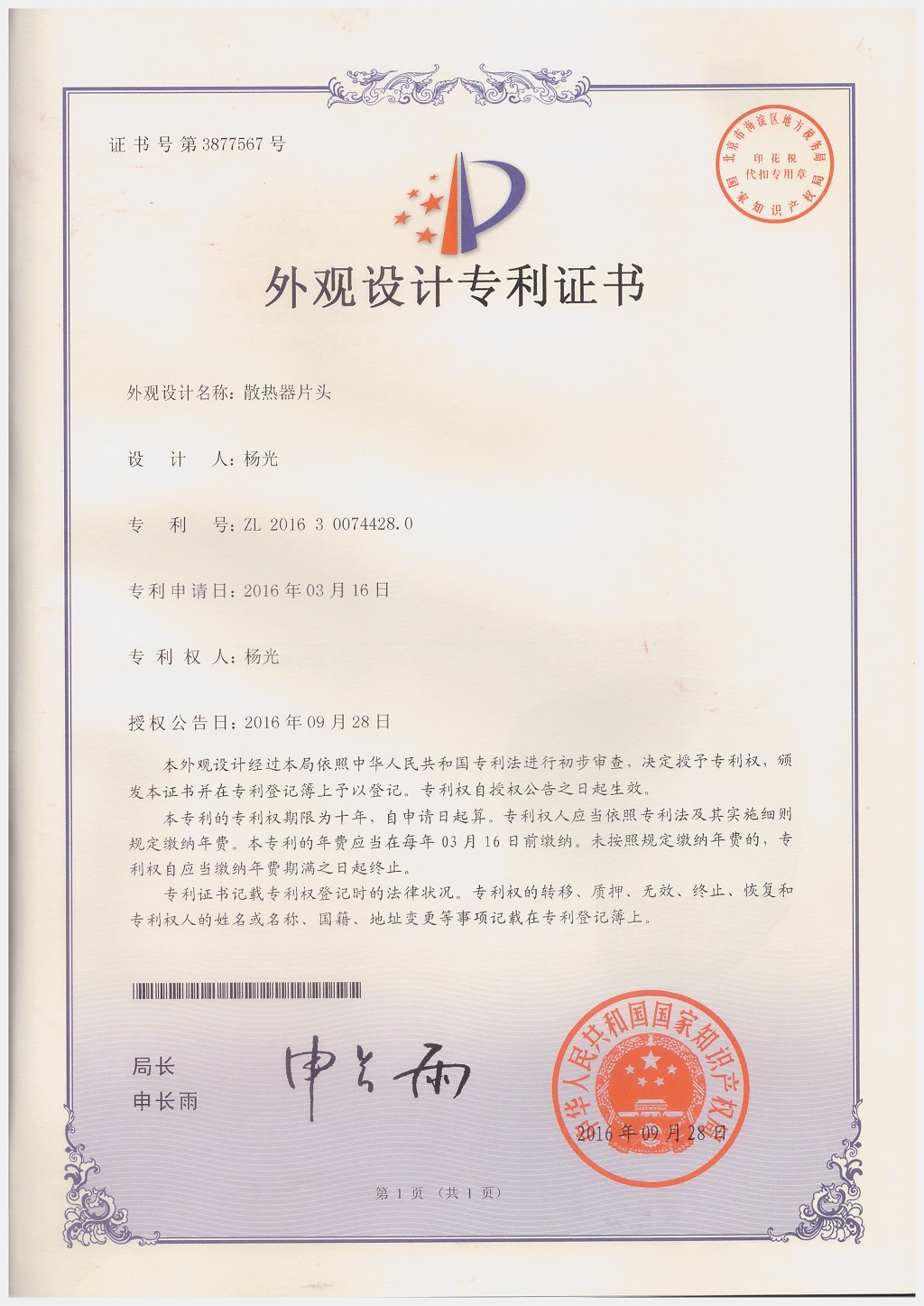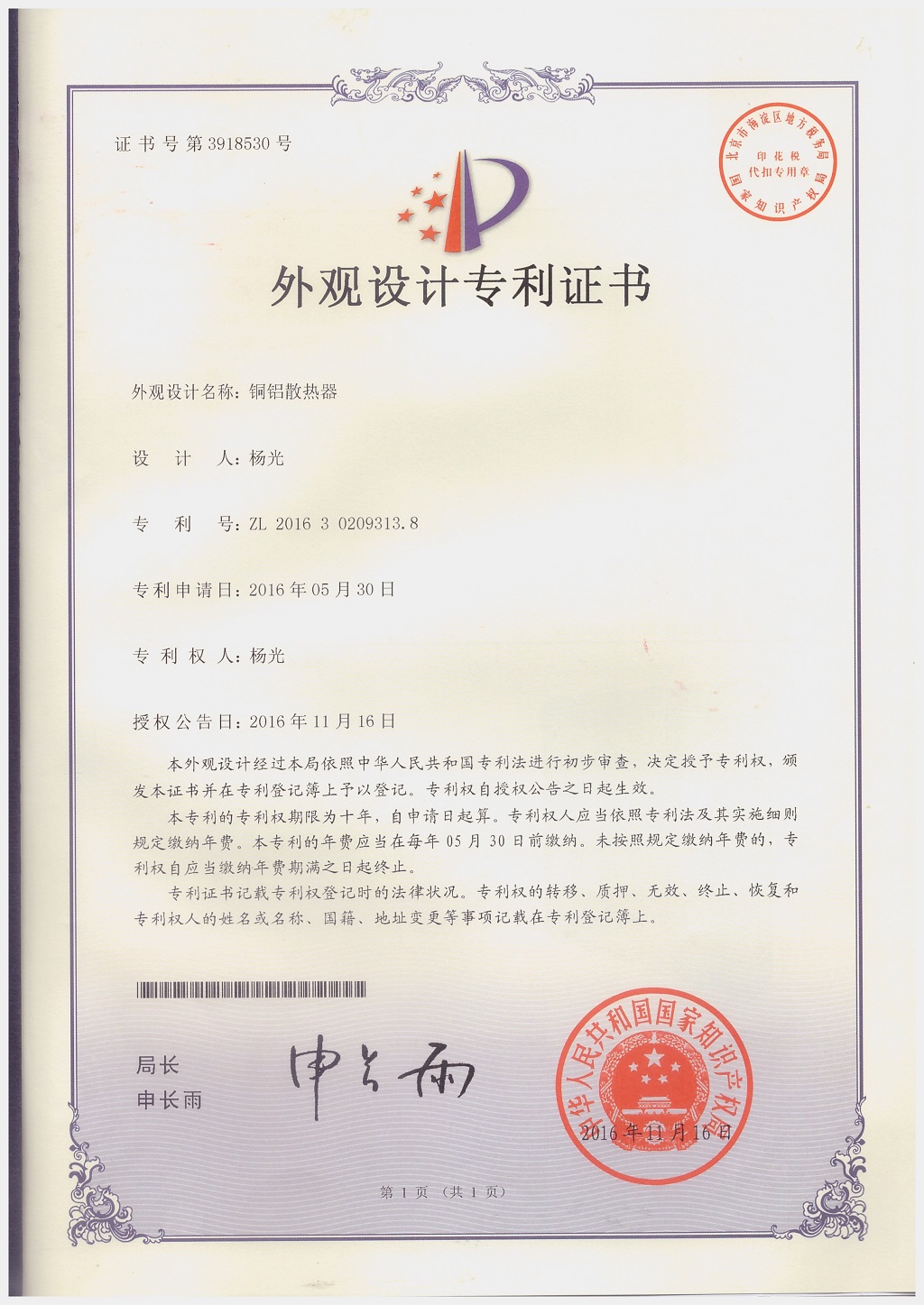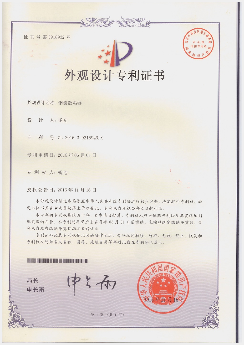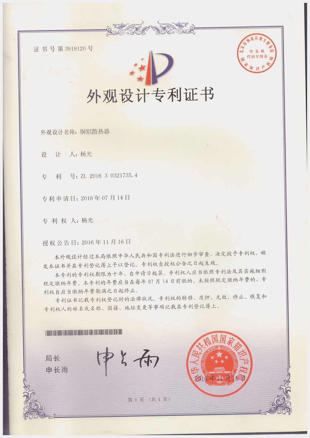 北京金旗艦暖通科技有限公司專利證書