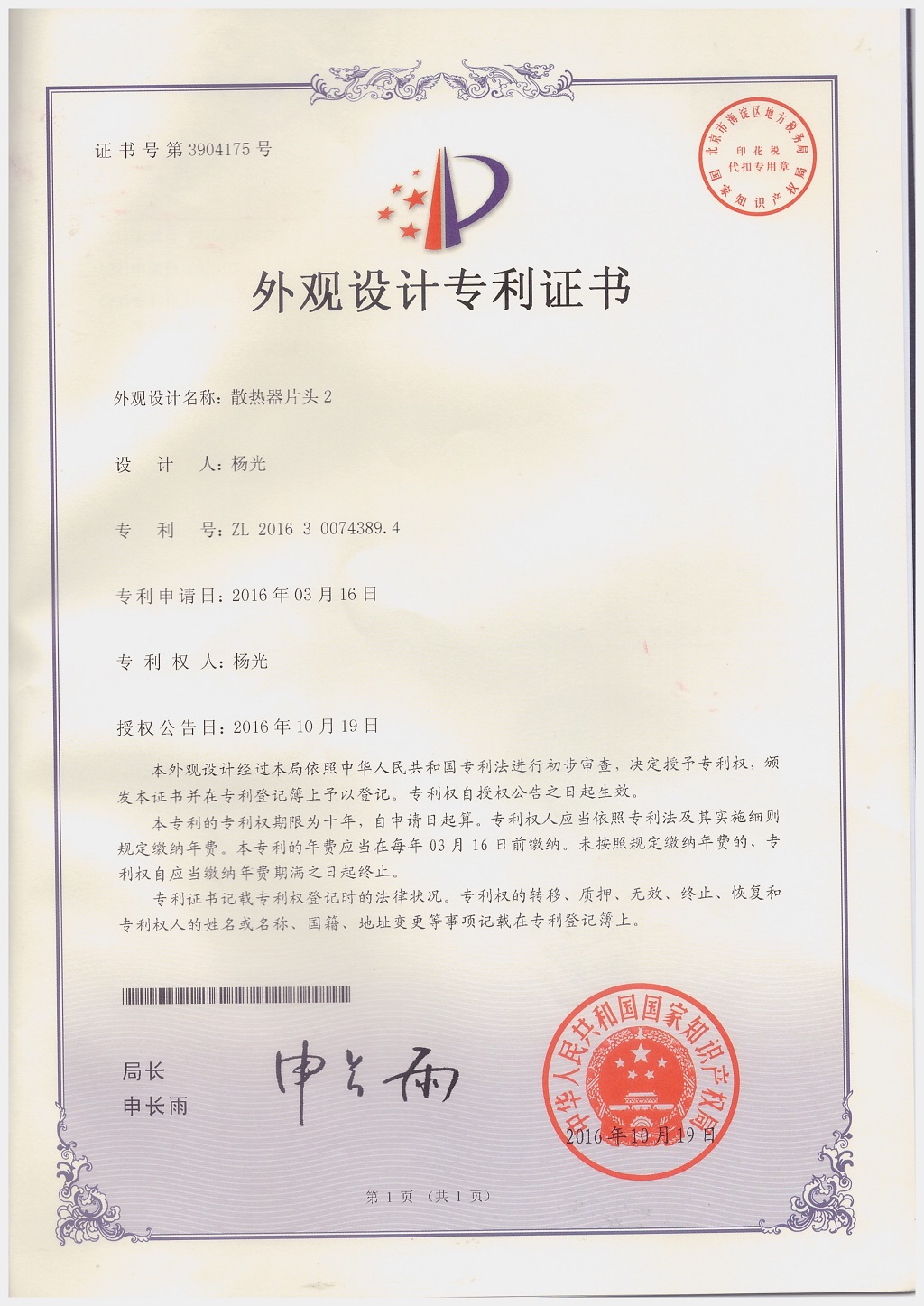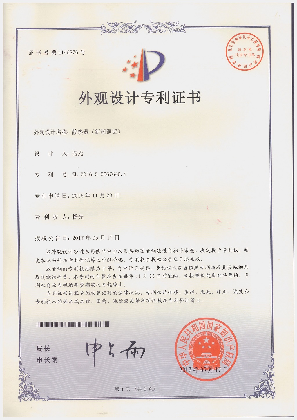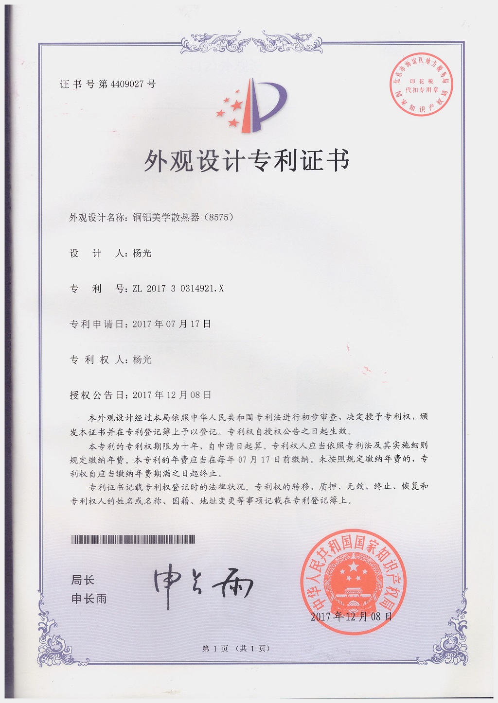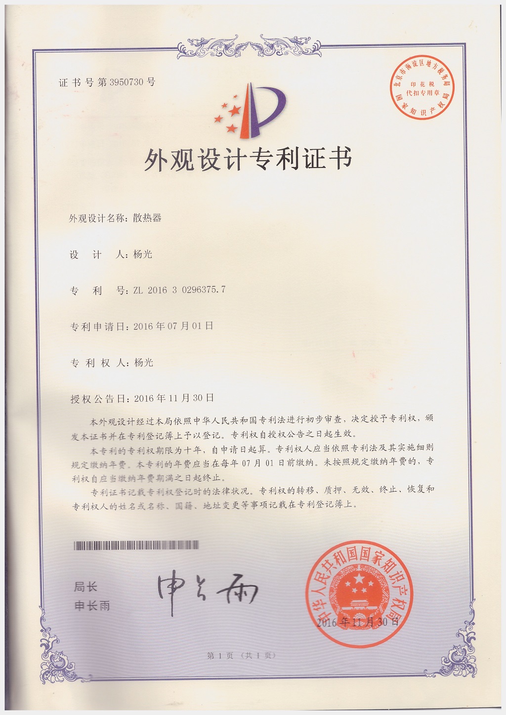 北京金旗艦暖通科技有限公司專利證書